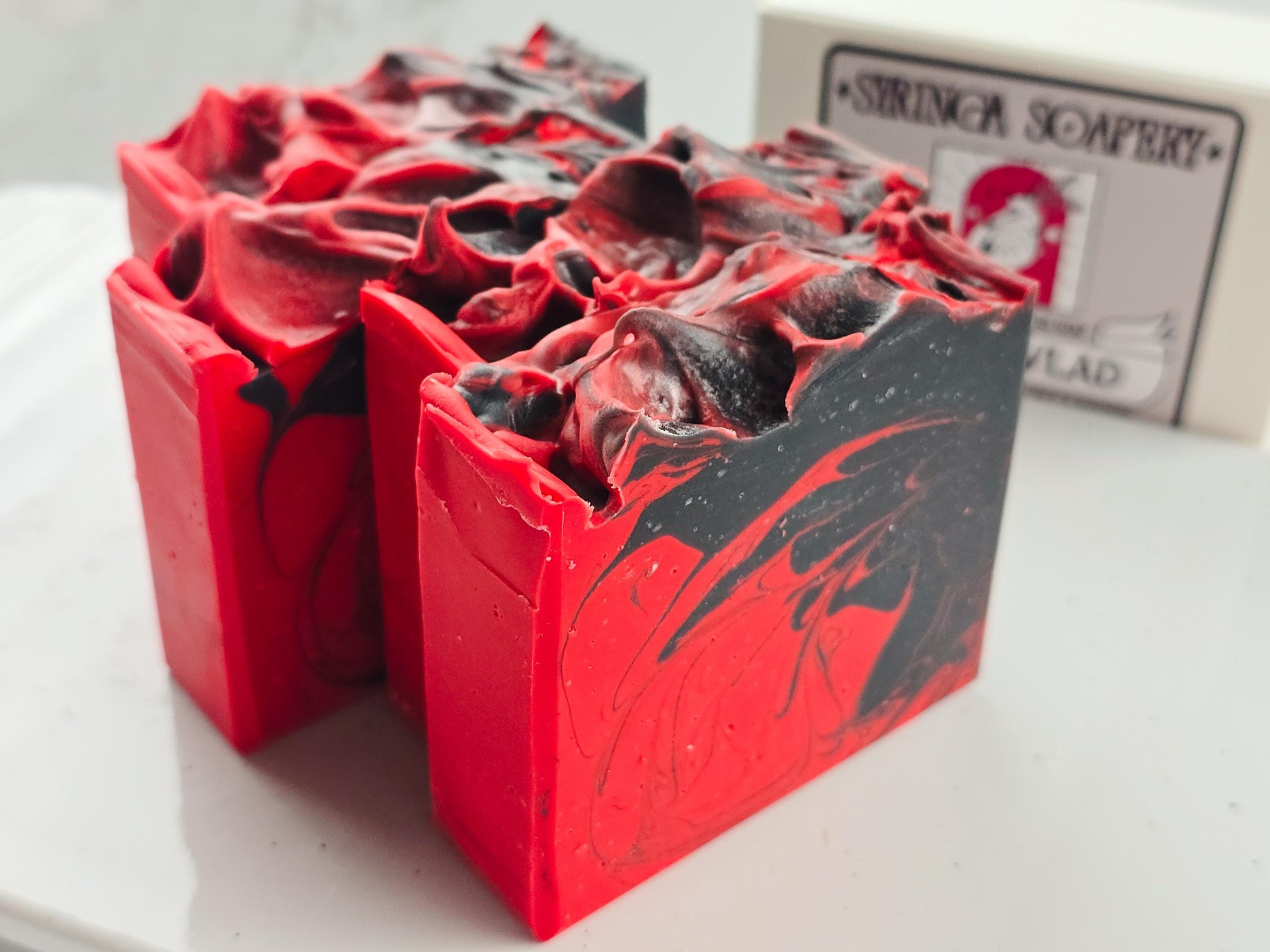 *NOTE: The pigments used to make the vibrant red and black colors of this soap may stain washcloths or other absorbent materials.